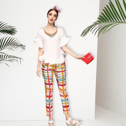 歐洲站2015夏季新款女釘珠項鏈裝飾荷葉邊喇叭袖上衣格紋褲子