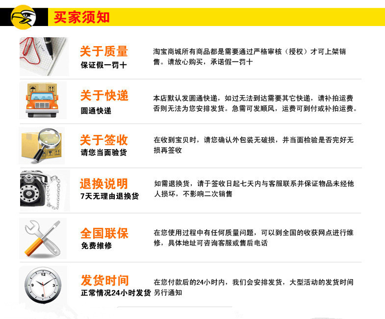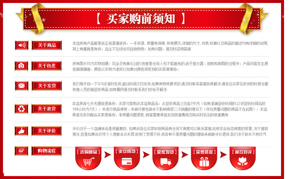 注意事項 1,所有商品支持支付寶交易,運費都由買家承擔。 2,未付運費訂單,一律用順豐快遞,運費到付! 3,拍下未注明顏色,一律隨機發貨! 4,下單時請準確填寫好地址,運費,否則造成損失,一律由買家承擔! 5,大額訂單,公司支持分期付款,30%定金,發貨前來廠驗貨付清70%尾款! 6,凡是商品質量問題,7天!無理由!包換!