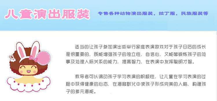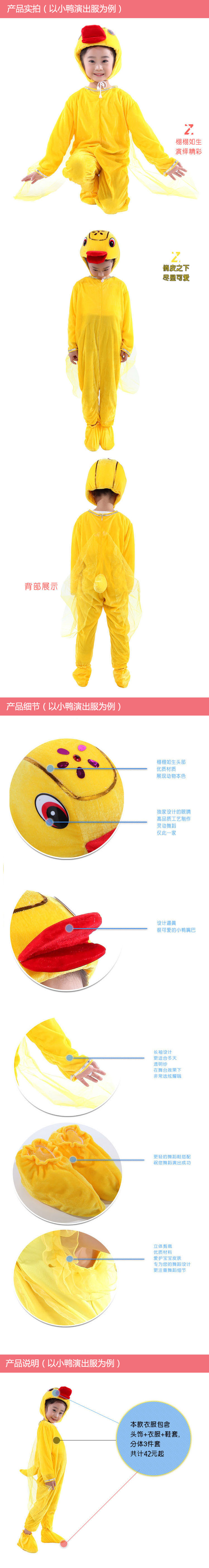 動物演出服裝選用金絲絨面料制作,適合身高110--120厘米之間即3-6歲的幼兒穿戴(注:里面以穿薄內衣的為佳,不然會直接影響效果),除以上說明的身高外都需要定做,家長或老師要量好孩子的身高。注:網上服裝價格是110厘米的價格,身高超過110厘米的每增高10厘米需加6元,如果單買衣服的需另外購買鞋子每雙6元。