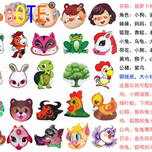 拔蘿卜、小壁虎借尾巴、小貓釣魚、狐假虎威、小蝌蚪找媽媽、丑小鴨的故事、小兔乖乖、小熊請客、三只小雞、小豬變形記、鳥窩里的樹、三只小羊和狼、小兔子找太陽、一顆鈕扣、龜兔賽跑、小馬過河、金雞冠公雞、蝸牛的獎杯、三只小豬、小紅帽、小熊拔牙、小豬變干凈了、聰明的**、下雨的時候、老鷹抓小雞、守株待兔、小猴賣圈、三只蝴蝶、金色的房子、棉花姑娘、我會飛、大灰狼和兔子、小羊和狼、狼和七只小羊。還有很多故事類頭飾**不列舉了,親們可以自己選購單個組合成故事類頭飾。