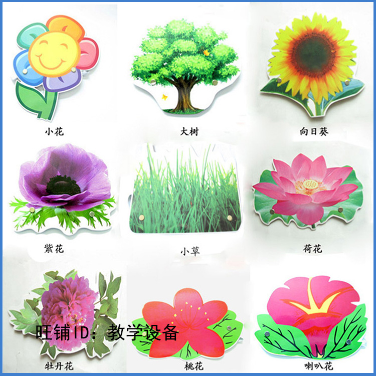 西瓜、香蕉、蘋果、葡萄、菠蘿、桃子、桔子、梨、芒果、榴蓮、石榴、草莓、菠菜、絲瓜、青菜、白菜、包菜、黃瓜、冬瓜、南瓜、番茄、茄子、牡丹花、荷花、葵花、喇叭花、桃花、玫瑰花、紫色花、小花、小草、大樹