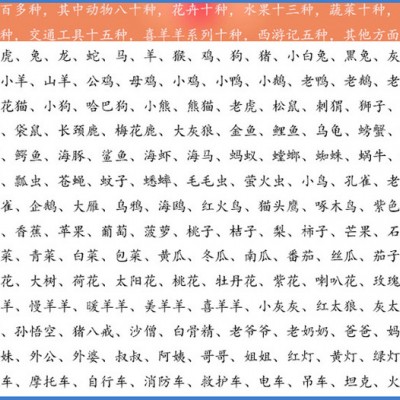 西瓜、香蕉、蘋果、葡萄、菠蘿、桃子、桔子、梨、芒果、榴蓮、石榴、草莓、菠菜、絲瓜、青菜、白菜、包菜、黃瓜、冬瓜、南瓜、番茄、茄子、牡丹花、荷花、葵花、喇叭花、桃花、玫瑰花、紫色花、小花、小草、大樹