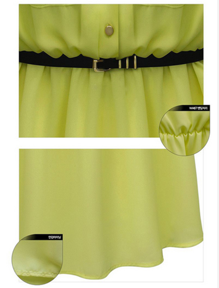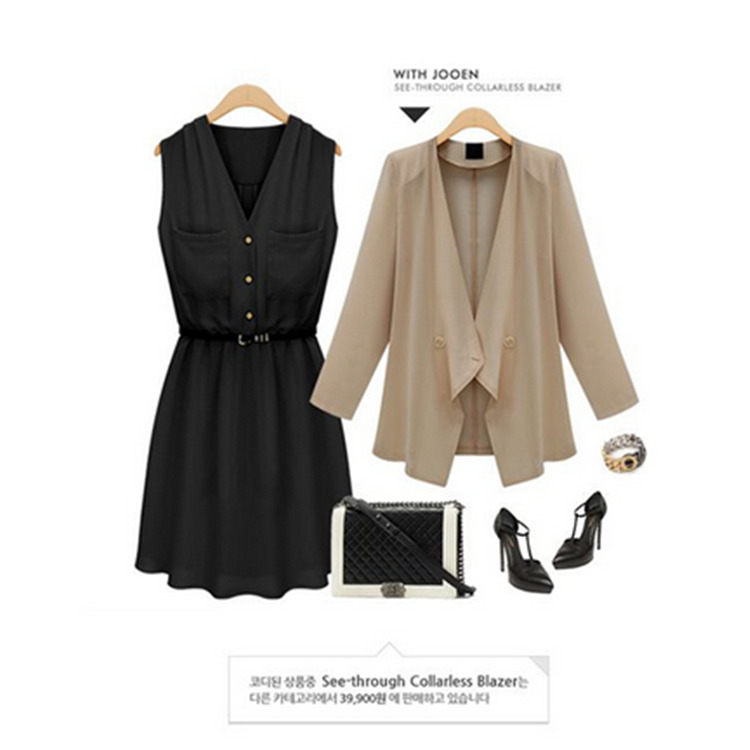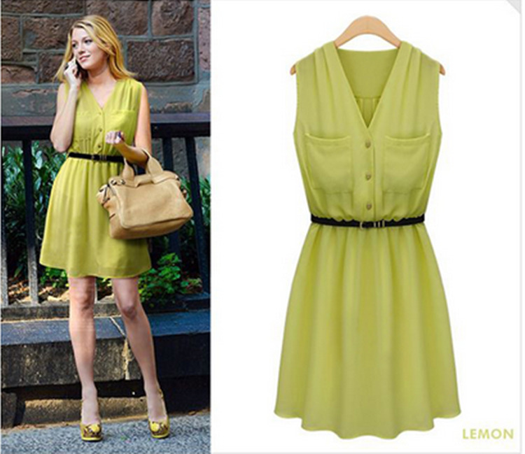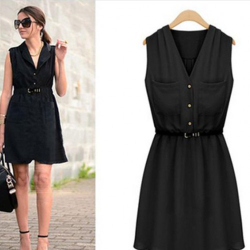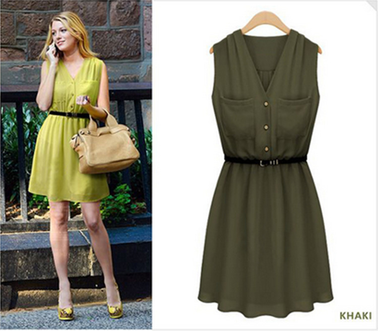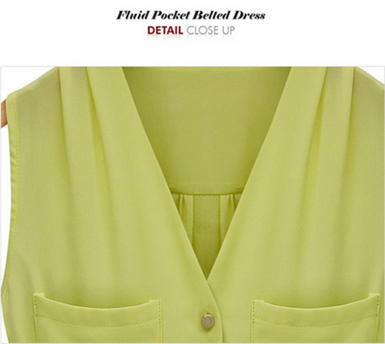 2015歐美夏季新款明星同款(送腰帶)口袋紐扣裝飾V領雪紡背