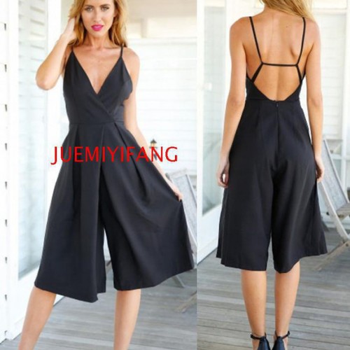 速賣通ebay亞馬遜熱賣黑色吊帶性感深V領時尚闊腿褲連體褲女