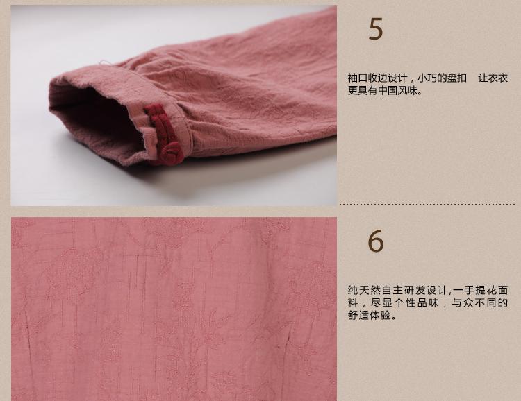 主要材質:棉—**植物.舒適吸汗保暖。麻—天然植物纖維.自然舒適健康。—古樸耐穿、冬暖夏涼、柔軟細膩、觸感獨特、閃閃動人。織錦緞—**典雅,色澤艷麗香云紗。透氣涼爽,平滑絢麗刺繡—懷古思情,民俗風格 慣用主要顏色:古樸米、原色白、稻草黃、古磚紅、橄欖綠、寧靜藍、芋頭紫、大地灰、等...各種撞色... 。民族風格、唐衣雋永美學,汲取民間藝術,淬飲**,穿梭中國靈魂的精髓所在。