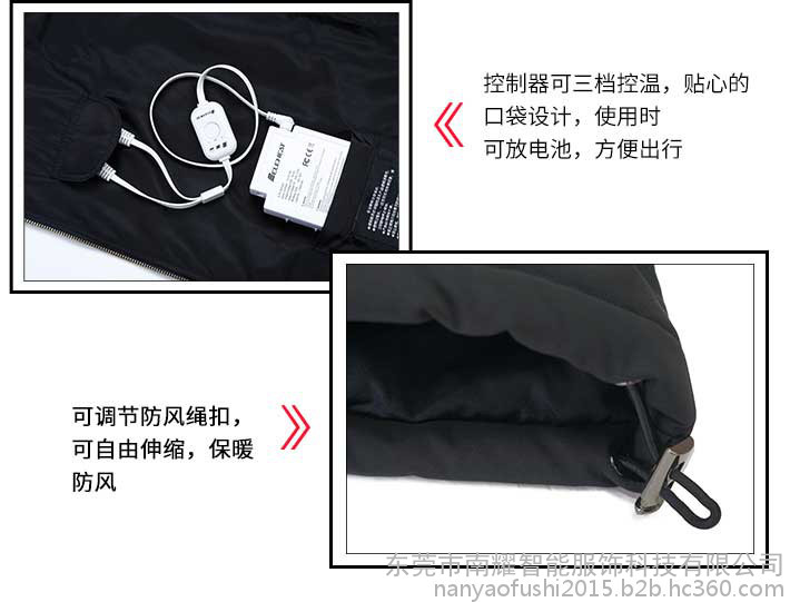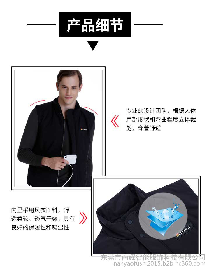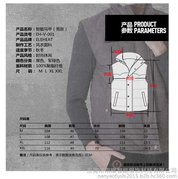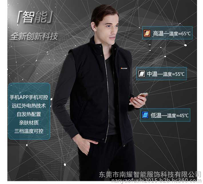 一、產品特點:APP一鍵,智能恒溫,三擋可調溫度,電池內設有智能檢測的芯片控溫,采用釋放遠紅外線的金屬纖維復合絲作為發熱材料;DC低電壓設計安全可靠。(不超人體安全電壓36V的四分之一)。發熱體的柔軟性在折疊或彎曲時都不會受損,且衣服可水洗,在人體各相應穴位肩、背部分設置有發熱片,內襯為納米遠紅外布。
