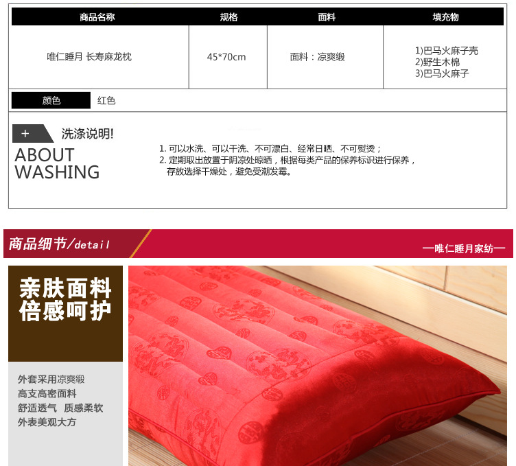 顏色:紅色 | 枕頭形狀:長方形 | 成分與含量**木棉 |