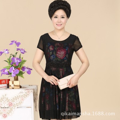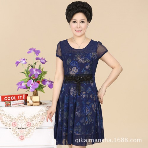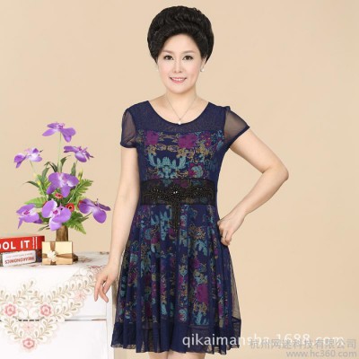 供應2014年夏季女裝中老年雙層雪紡連衣裙媽媽裝民族大碼燙鉆裙子批發