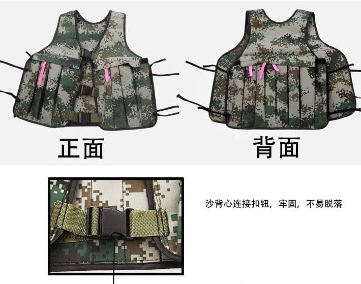 【說明】:前后各8個袋子,可以自己配種,裝入沙子、鋼條、鉛塊等配重。送16個小布沙袋。另可作為戶外運動背心穿著,前后共16個口袋,可用來裝東西,也是很好的選擇。