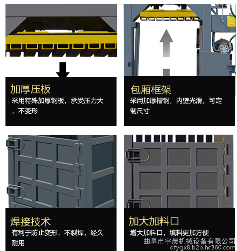 1、液壓打包機適用于PP、PE廢舊塑料薄膜、廢舊塑料農膜地膜大棚膜、PET塑料瓶、廢紙、紙片、廢棄舊紙箱、衣服等擠壓成長方形、正方形等形狀,以降低運輸成本。加料箱尺寸和包塊形狀尺寸可根據及戶原料規格設計定制。均采用液壓驅動,可選擇手動或PLC自動控制操作。