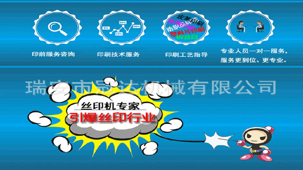 瑞安市冠達(dá)機(jī)械有限公司坐落于中國機(jī)械城(浙江省瑞安),是一家有十幾年技術(shù)經(jīng)驗(yàn)的機(jī)械制造廠。公司以大膽的創(chuàng)新、過硬的質(zhì)量與**的服務(wù)來生產(chǎn)和銷售。公司專業(yè)生產(chǎn)全自動(dòng)、半自動(dòng)、手動(dòng)絲網(wǎng)印花/網(wǎng)版印刷機(jī)械設(shè)備及絲印特印輔助設(shè)備,主要產(chǎn)品有全自動(dòng)橢圓型印花機(jī)、全自動(dòng)導(dǎo)帶印花機(jī)、手動(dòng)砂帶式膠條磨刮機(jī)等絲網(wǎng)印刷設(shè)備。公司產(chǎn)品廣泛適用于:印花行業(yè)、包裝行業(yè)、印刷行業(yè)、印染行業(yè),玻璃行業(yè)、電子行業(yè)、陶瓷行業(yè)、工藝品行業(yè)、服裝行業(yè)、皮革行業(yè)、金屬行業(yè)、木制品行業(yè)、紡織品行業(yè)、塑料制品行業(yè)、服飾行業(yè)、玩具行業(yè)、廣告行業(yè)、等多個(gè)行業(yè)整卷或單片單色、多色的**印刷工藝。