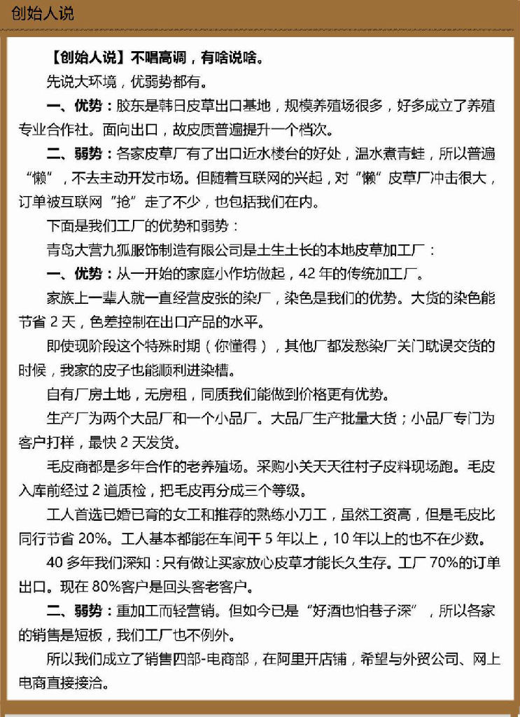 后來結(jié)果是,有一些地方,小武說的不錯,包括我們工廠的長處和特點,但是涉及到毛領(lǐng)子具體的特點細節(jié),沒有抓住重點,客戶有些猶豫**終沒有簽合同。小武很沮喪來我辦公室說辦的不好。我**和他分析,我們的毛領(lǐng)子,你要說出具體的優(yōu)勢特色好處來,先了解客戶的關(guān)心點,然后從這個點出發(fā),打消客戶的顧慮等等**小武心悅誠服,說再和客戶打電話補救補救吧。(——**毛領(lǐng)價格貉子毛領(lǐng)大衣毛領(lǐng)子水貂毛領(lǐng)——)