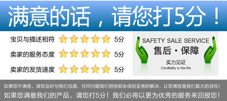 五、產品經檢驗合格包裝后出廠,若運輸途中損壞的請勿簽收,并及時通知賣家,本店會向物流公司提出索賠,一切以客戶利益為重。同時本店會在第一時間為客戶重新免費發貨。