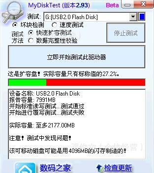 第二:使用官方的"數碼之家(MyDiskTest)"U盤檢測工具進行檢測,檢測方法如下圖所示!軟件可以在百度自己搜索下載,方便簡單
