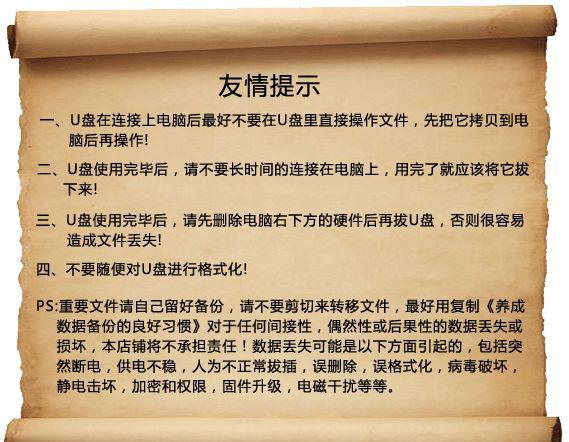 重要文件請自己留好備份,請不要剪切來轉移文件**用復制《養(yǎng)成數據備份的良好習慣》對于任何間接性,偶然性或后果性的數據丟失或損壞,本店鋪將不承擔責任!數據丟失可能是以下方面引起的,包括突然斷電,供電不穩(wěn),人為不正常拔插,誤刪除,誤格式化,病毒破壞,靜電擊壞,加密和權限,固件升級,電磁干擾等等。