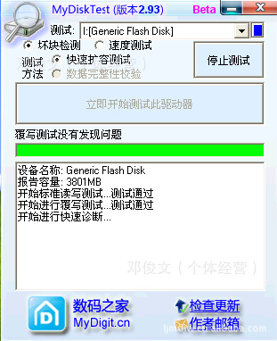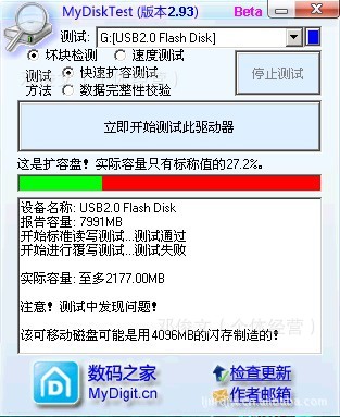 第二:使用官方的"數碼之家(MyDiskTest)"U盤檢測工具進行檢測,檢測方法如下圖所示!軟件可以在百度自己搜索下載,方便簡單
