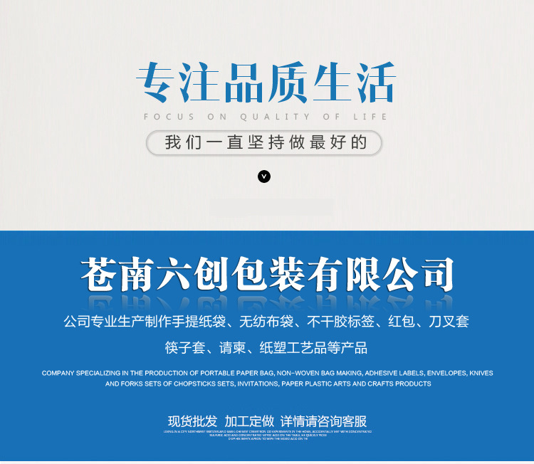 蒼南六創包裝有限公司,主要經營紙包裝制品、手提紙袋、紅包、刀叉套、筷子套、請柬、紙塑工藝品、無紡布制品、塑料制品、不干膠制品、金屬制品、橡膠制品、標簽、標牌、日用百貨、木制品、布制品、旗幟(不含**)生產、加工、銷售。于2016年4月7日在溫州工商局登記注冊,業務經理是楊仲旦,公司注冊資本1000000(萬元),我公司的辦公地址位于中國民營經濟發展的先發地區與改革開放的前沿陣地--溫州,浙江 溫州 蒼南縣龍港鎮鑒后垟村繁榮大道120號,我們有**好的產品和專業的銷售和技術團隊,公司發展迅速,我們為客戶提供**好的產品、良好的技術支持、健全的售后服務,蒼南六創包裝有限公司是溫州包裝行業知名企業,歡迎各界朋友蒞臨參觀、指導和業務洽談。