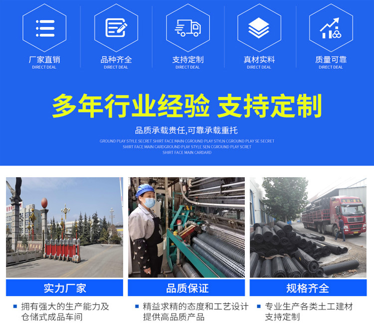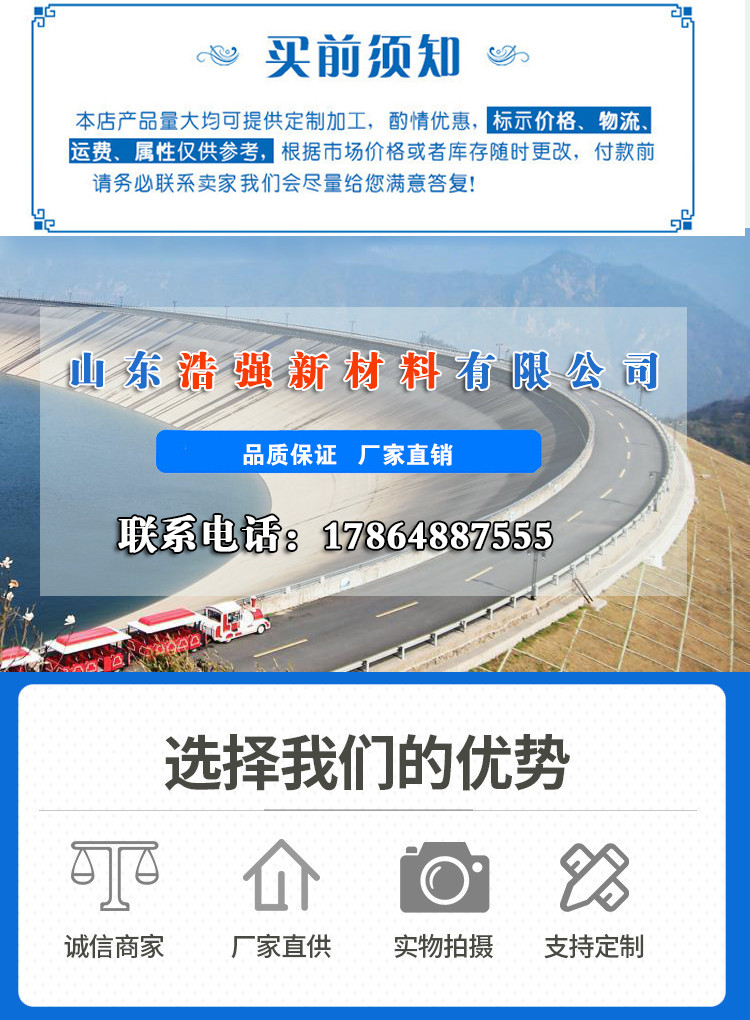 | 山東浩強新材料有限公司,公司位于"五岳**"泰山西麓的肥桃之鄉—山東省泰安-肥城市,東20公里緊靠京滬高鐵泰安站和京滬、京福高速公路,南臨孔子故里——曲阜,西80公里直達京九鐵路,北距濟南國際機場80公里,地理位置優越,交通便捷,通訊發達。 山東浩強新材料有限公司是國內較早專業從事土工材料及新型工程材料生產、研發的高科技民營企業;是"中國土工合成材料工程協會"會員單位;肥城市納稅**企業。公司占地60000平方米,固定資產1.8億元,年產土工合成材料及新型復合材料5000噸,年銷售收入2.2億元,利稅900萬元。現有員工300余人,其中具有高中級以上職稱的專業技術人員50名,擁有德國卡爾邁耶(KARL MALIMO)高速"拉舍爾"經編機、瑪里莫(MALIM0)多軸向織機、道尼爾織機,并掌握門澤爾公司涂層技術。公司自成立至今已有15年的發展歷程,現有各種土工格柵生產線13條,土工布和土工膜生產線5條,土工格室生產線2條,聚酯玻纖布生產線1條,防裂貼生產線2條,其他土工材料生產線3條,并提供產品進出口代加工服務(如:玄武巖纖維土工格柵)。 山東浩強新材料有限公司主要產品有:玻纖土工格柵(含自粘性玻璃纖維土工格柵)、滌綸經編土工格柵、鋼塑復合土工格柵、PP塑料焊接土工格柵、雙向塑料拉伸土工格柵、單向塑料拉伸土工格柵、HPDE聚乙烯土工格柵、聚酯玻纖布、長絲土工布、短纖針刺土工布、透水養護土工布、復合土工膜、防水板、土工格室、防裂貼(抗裂貼)、三維植被網、無紡布、高強度土工網、工程纖維及多種新型復合材料。產品質量已達到國際標準。其產品廣泛應用于公路、鐵路、機械、水利、電力、航空、航天、軍事、化工、石油、水土保持及環境綠化與基礎設施建設領域,產品受到工程界專家及廣大用戶的一致好評,并受到國內外有關專家的認同和贊譽。 山東浩強新材料有限公司始終堅持"誠信務實、服務社會"的經營理念,愿與國內、國際各界朋友真誠合作,共同為建設事業做出更大貢獻!攜手發展!共創美好明天! |