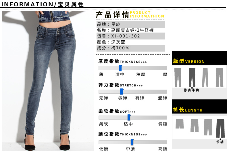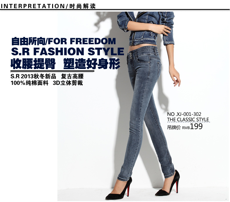 供應星旋高腰排扣牛仔褲女修身顯瘦小腳褲