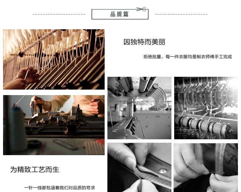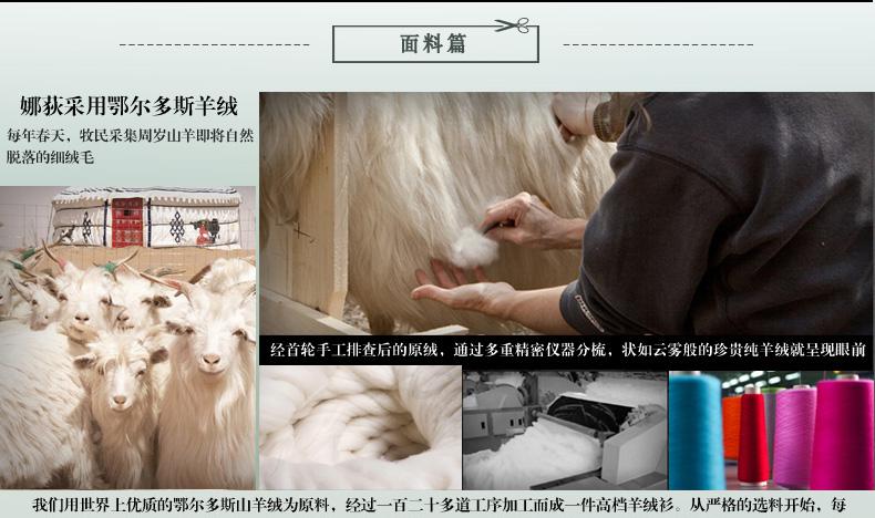 純正羊絨,高端體驗(yàn) 羊絨,來源于冬天山羊毛根部一層薄薄的細(xì)絨, 產(chǎn)量稀少,價(jià)格昂貴,有著“纖維寶石”“軟黃金”之稱。 其柔軟、保暖、輕盈強(qiáng)韌,是普通羊毛所無法比擬的。 這款羊絨衫,精選天然**細(xì)羊絨,輕盈又保暖。 針織羊絨所獨(dú)有的天然延展性, 又使它有著**的彈性,穿著合身而舒適。 精致工藝,美觀實(shí)穿 **羊絨材質(zhì),加上細(xì)膩的手工編織工藝, 手感膨松豐潤,絨感十足,帶來一觸即知的輕盈溫暖感受。 袖口、下擺采用1X2羅紋收邊采用放跑馬針手工工藝, 實(shí)穿又美觀,打造厚實(shí)收束感。下擺羅紋,反面滿針, 挺括不收縮,同時(shí)又有著厚重的垂墜感, 使下擺更能凸顯出獨(dú)特設(shè)計(jì)感。 肩袖連接處采用邊留針工藝,略微點(diǎn)綴,低調(diào)美觀又獨(dú)特。 下擺開叉處特別采用三平針工藝,不易卷邊、變形。 腋下一次性減針采用了復(fù)雜費(fèi)時(shí)的套針法 這樣出來的成品羊絨衫鋪開在平面上,腋下部分不平展, 但更富有立體感,符合人體著裝并且能夠增強(qiáng)腋下強(qiáng)力,更強(qiáng)舒適, 增強(qiáng)做工精良性, 高端產(chǎn)品與普通產(chǎn)差別與此 量體定制,輕奢優(yōu)雅 “重新定義一件好的羊絨衫” 娜荻羊絨”開啟互聯(lián)網(wǎng)羊絨服飾量體定制新時(shí)代, 不將**,不妥協(xié) 只為舒適。 ”娜荻“量體定制業(yè)務(wù)是喜好羊絨服飾的消費(fèi)者 首創(chuàng)開展的一項(xiàng)個(gè)性化定制業(yè)務(wù)。您所定制的服飾原料將采用 鄂爾多斯地區(qū)被譽(yù)為“纖維鉆石”**山羊絨 加之獨(dú)具特色的設(shè)計(jì)風(fēng)格和精良的綠色生產(chǎn)工藝 來實(shí)現(xiàn)你的定制風(fēng)格 實(shí)現(xiàn)你所定制的**
