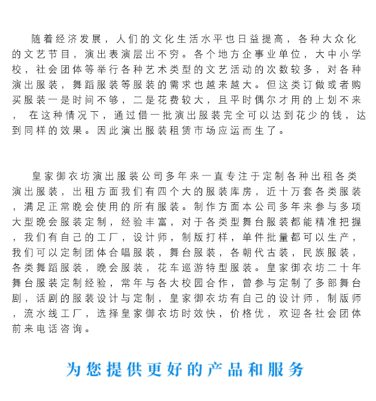 隨著經濟發展,人們的文化生活水平也日益提高,各種大眾化的文藝節目,演出表演層出不窮。各個地方企事業單位,大中小學校,社會團體等舉行各種藝術類型的文藝活動的次數較多,對各種演出服裝,舞蹈服裝等服裝的需求也越來越大。但這類訂做或者購買服裝一是時間不夠,二是花費較大,且平時偶爾才用的上劃不來, 在這種情況下,通過借一批演出服裝完全可以達到花少的錢,達到同樣的效果。因此演出服裝租賃市場應運而生了。