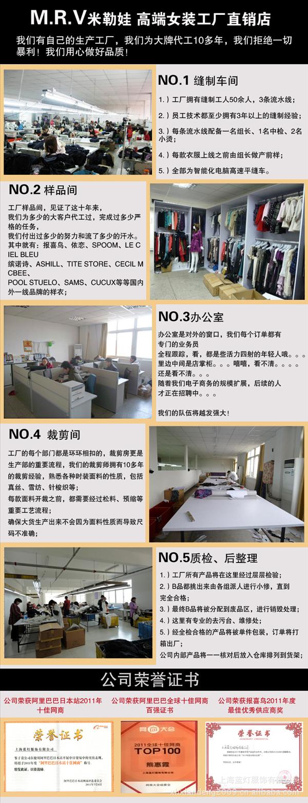 公司介紹 本公司常年生產(chǎn)高品質(zhì)女時裝,其中大致分為:外套、大衣、風(fēng)衣、棉衣、羽絨服、連衣裙短裙、褲子、針織衫、打底衫、打底褲、背心、雪紡衫、蕾絲衫、襯衫等等;產(chǎn)品遠銷日本市場,品質(zhì)可通過第三方檢品,現(xiàn)有員工30-50人,支持小批量訂單生產(chǎn); 公司主要客戶群體為:國內(nèi)外貿(mào)易公司、國內(nèi)外批發(fā)零售商、國內(nèi)**品牌時裝公司、淘寶商城、淘寶店掌柜、獨立網(wǎng)站系統(tǒng)、電視購物等等; | ||