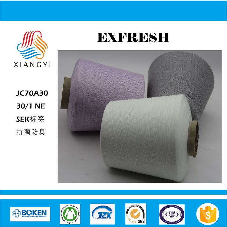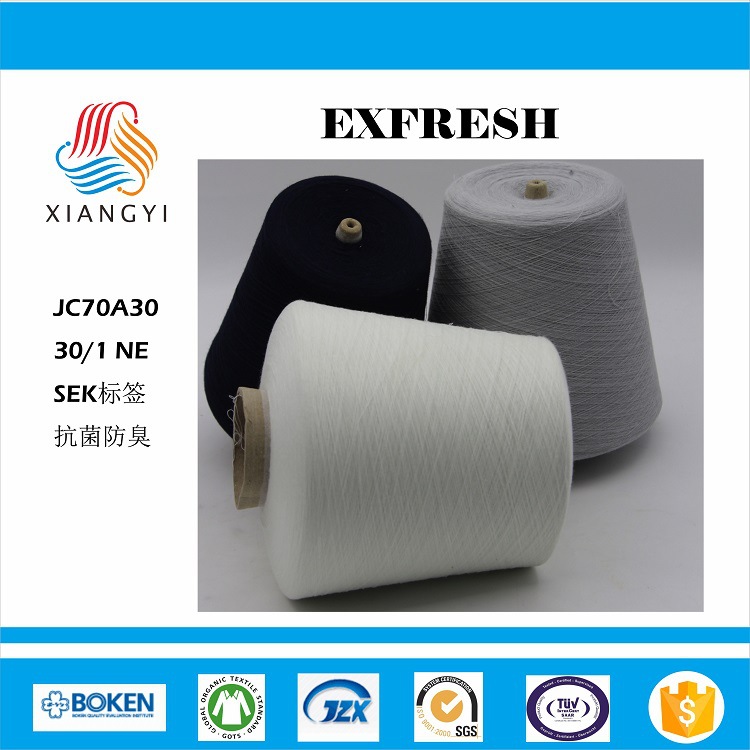 EXFRESH:抗菌防臭紗線,是腈綸纖維在原絲生產環節中添加有機納米抗菌劑的功能紗線。東洋紡腈綸是東洋紡公司開展“清潔、安心、舒適”為基本概念的功能材料。他能達到SEK的高標準抗菌防臭效果;具有優良的安全性和持久的耐洗滌性能。
