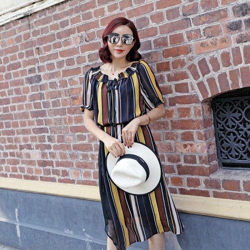 連衣裙女夏裝中長款歐美2017新款寬松顯瘦短袖豎條紋花裙百搭裙子