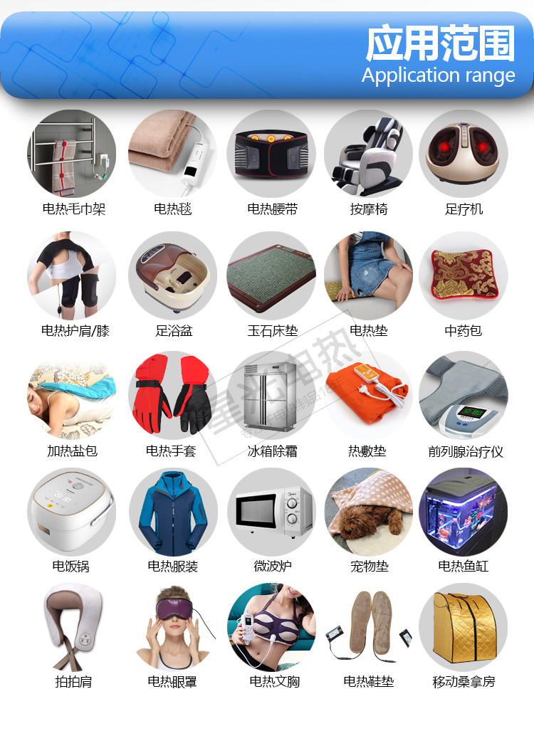 產品分為1拖1發熱片,1拖2發熱片,1拖2發熱片,1拖4發熱片,1拖5發熱片等類別,功率分為3.2W-9W不等,耗電能量低于普通發熱片,可以大大延長電池的使用時間,采用納米纖維做為加熱導體,發熱更均勻,壽命是普通材料的十倍,尺寸等要求可以按照要求加工….