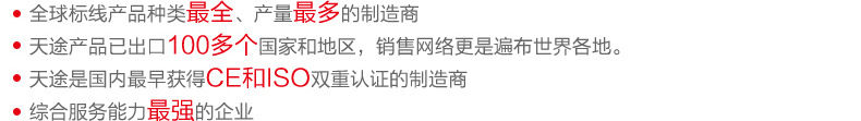 天途是一家國際道路專業產品制造領域產品群組**、出口****多、創新能力較強,且致力于全球化發展的綜合性集團公司。天途是天途路業集團旗下專業從事道路標線產品及其它交安設施產品研發、生產與銷售的全球知名品牌,也是天途路業集團旗下各制造產業品牌中歷史**的品牌。 天途品牌將繼續弘揚其技術創新活力、精益制造優勢及重視客戶體驗傳統,通過其國際**的技術研究機構、7家現代化的生產制造工廠及多支精干高效的營銷服務團隊,致力于上述道路標線專用產品及其它道路交通安全附屬設施的研發、制造與銷售。 伴隨著天途從小到大、從大到強、從中國走向世界,天途定會在更廣闊領域、以更高標準幫助客戶永續提升價值。 |