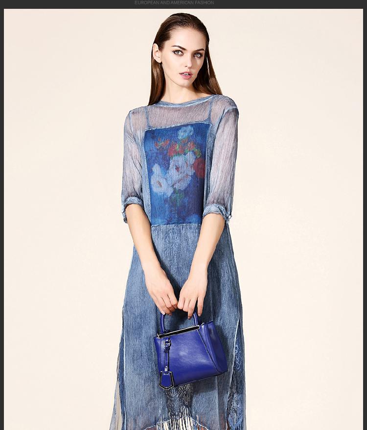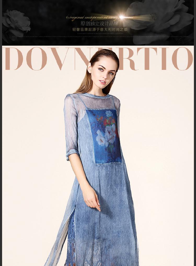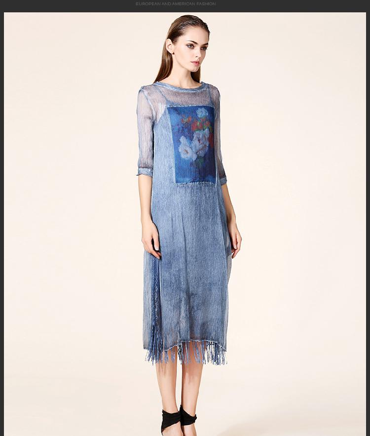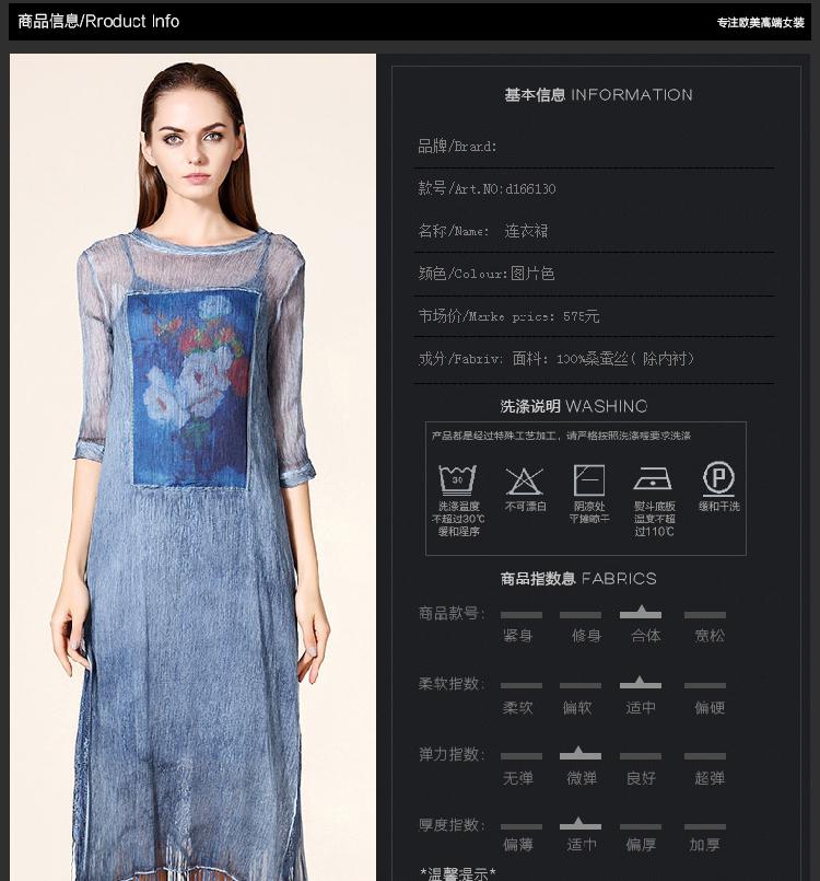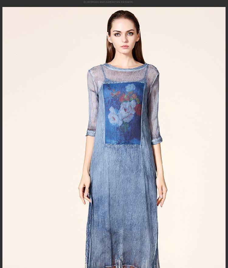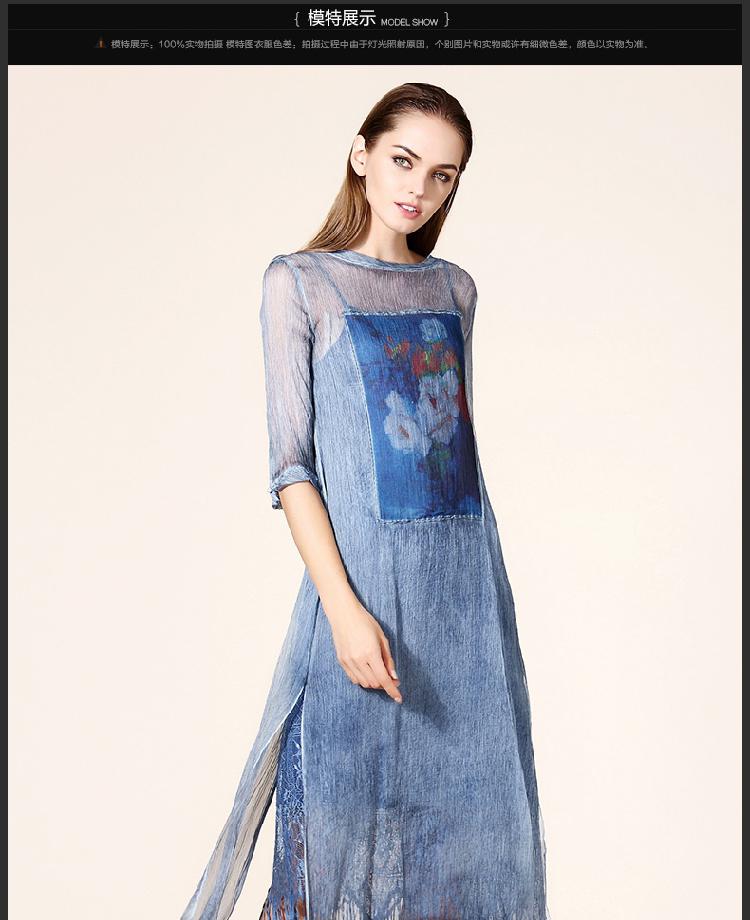 歐洲站時尚裙子復古印花絲麻女裙長裙七分袖真絲連衣裙2016夏