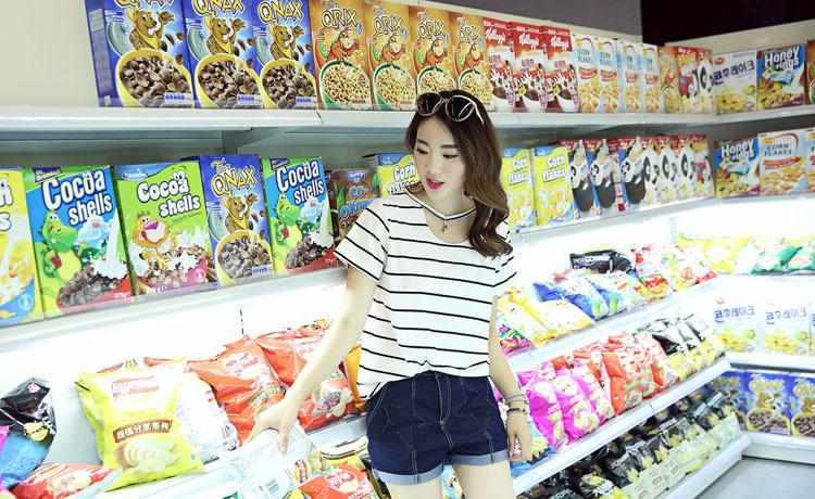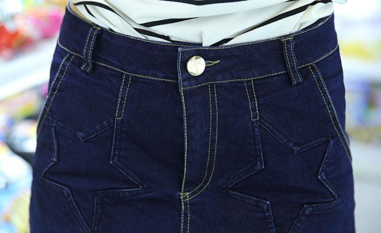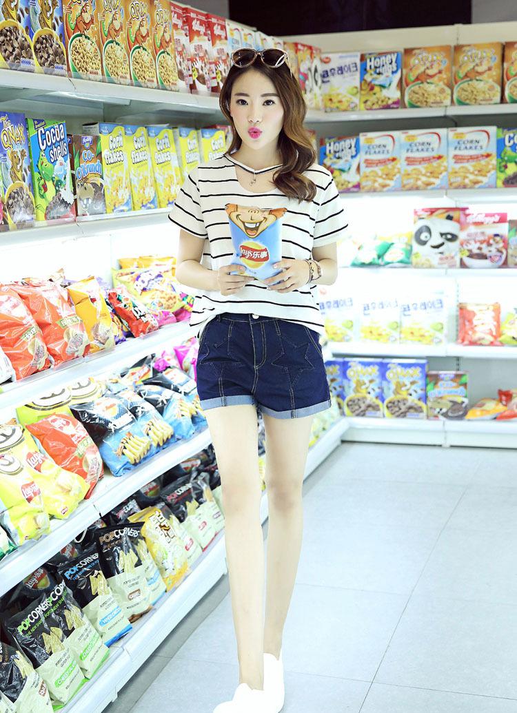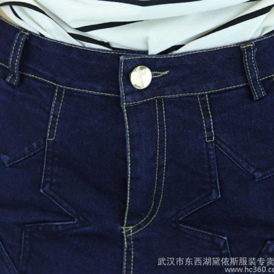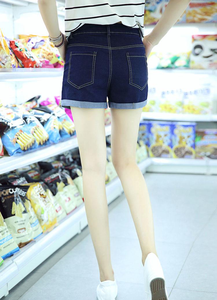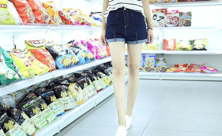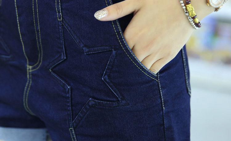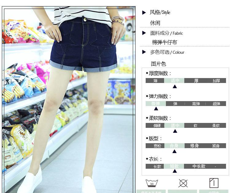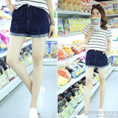 2016夏季短褲女修身直筒深色翻邊五角星圖案中腰牛仔短褲一件