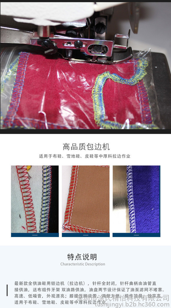 新款全供油鞋用鎖邊機(拉邊機),針桿全封閉,針桿曲柄由油管直接供油,送布組件牙架雙油路供油,油盤兩節設計保證了油泵濾網不堵塞。