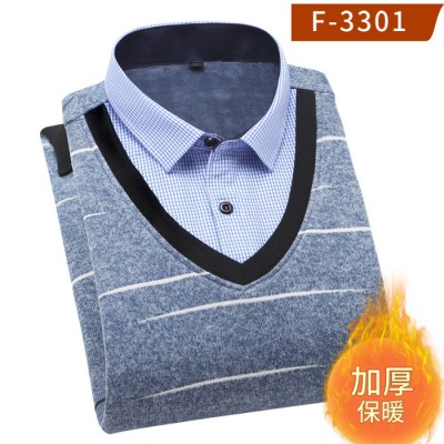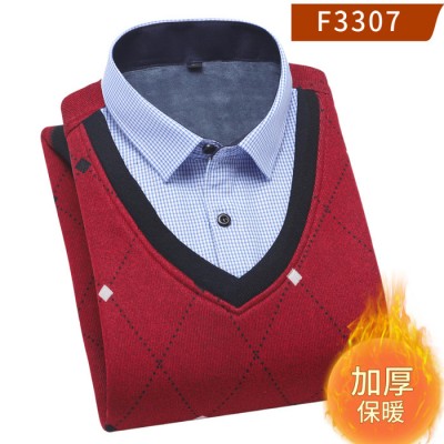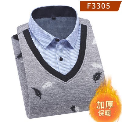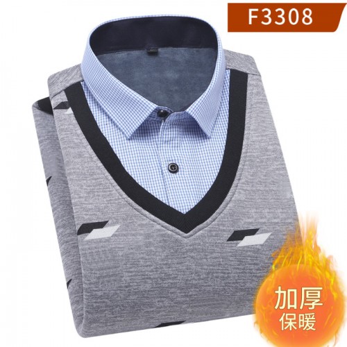 **貨源男士套頭加絨V領假兩件襯衣男士雞心領保暖襯衫保暖上衣批發