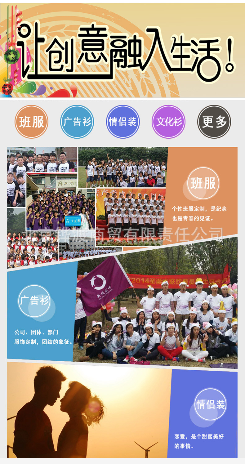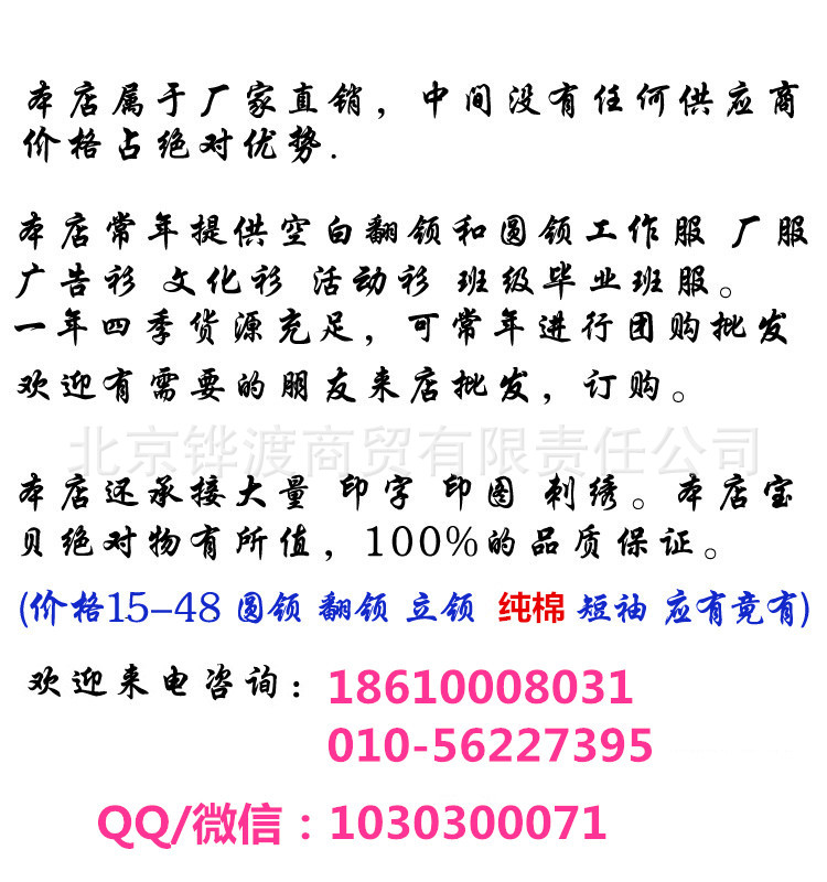 本廠常年批發各種顏色空白文化衫、T恤衫,承接訂做各種宣傳促銷廣告衫、禮品T恤,各種慶典活動、運動會、演唱會、歌迷、球迷、拉拉隊T恤、學生班服等,用途廣泛,已得到了客戶們的認可好評!可根據客戶要求印制各種圖案以及公司企業標(logo),印制費用另收,詳情請旺旺或電話聯系。<>