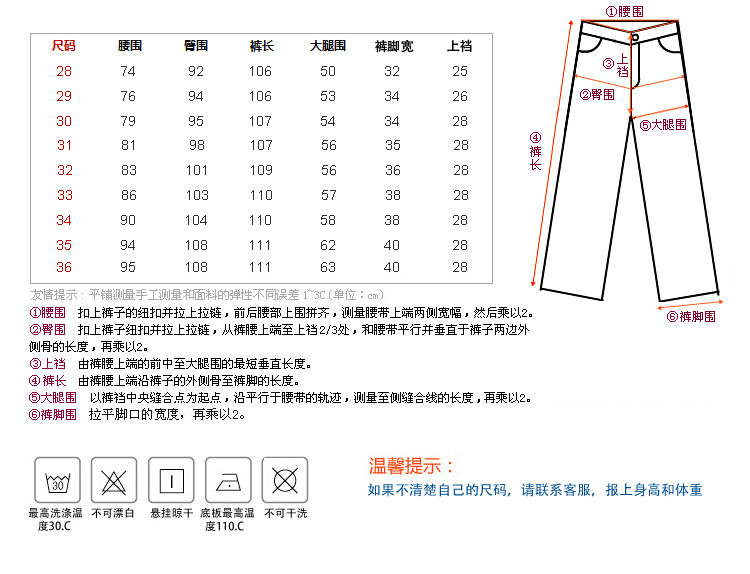 誤差范圍:1~3CM | 尺碼:28、29、30、31、32、33、34、36 |