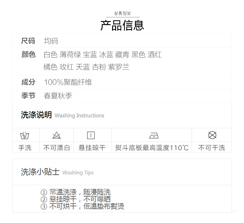 顏色 | 白色,黑色,桔色,紫羅蘭,冰藍,棗紅,天藍,薄荷綠,藏青,玫紅,杏粉,寶藍,白色(長款),黑色(長款),冰藍(長款),紫羅蘭(長款),天藍(長款),杏(長款) |