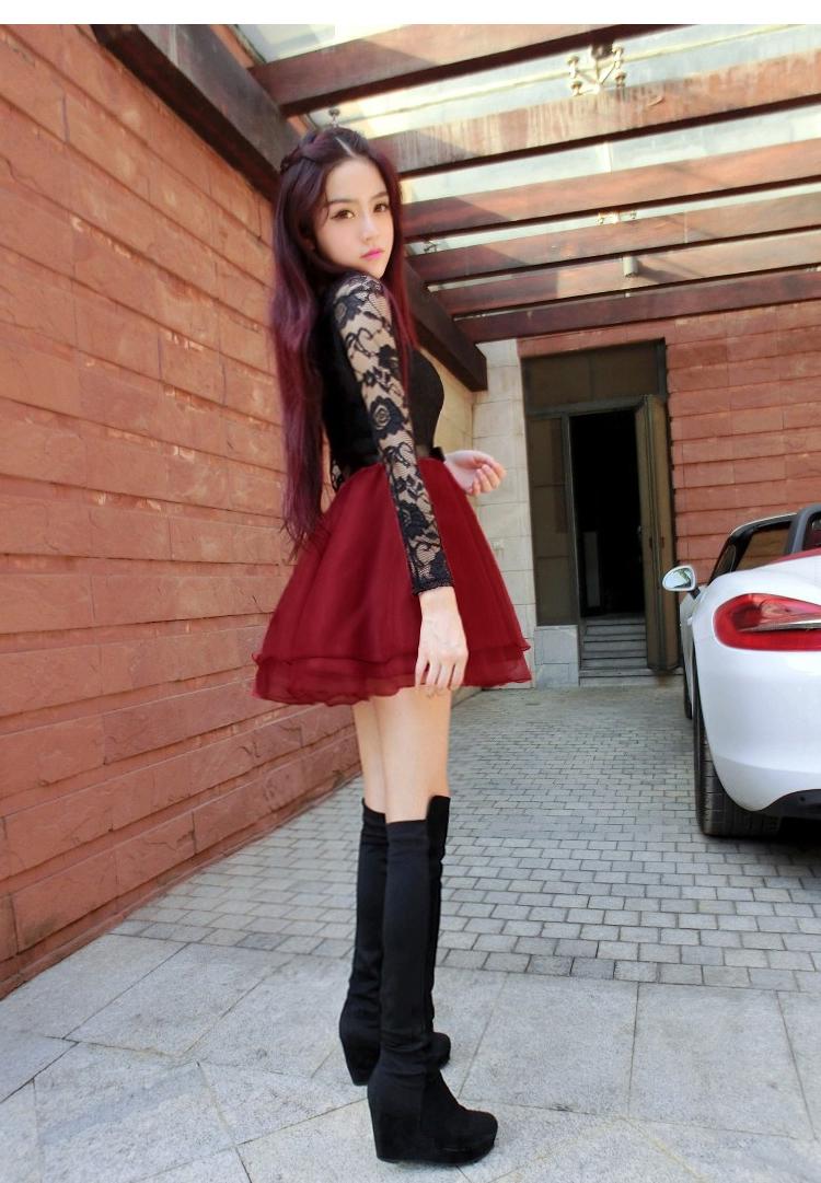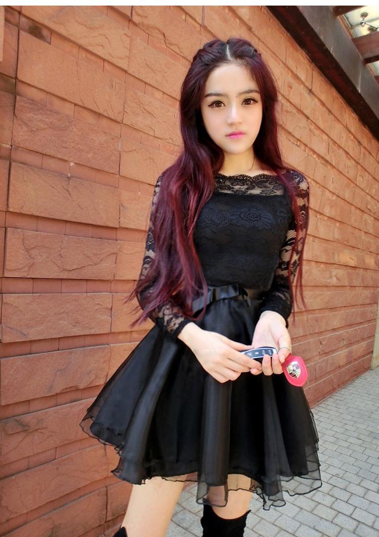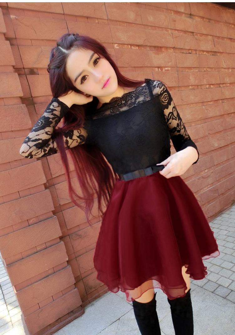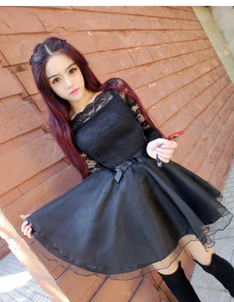 X310-1205 2015新款韓版女連衣裙子 蕾絲蝴蝶結大擺裙長袖連衣裙