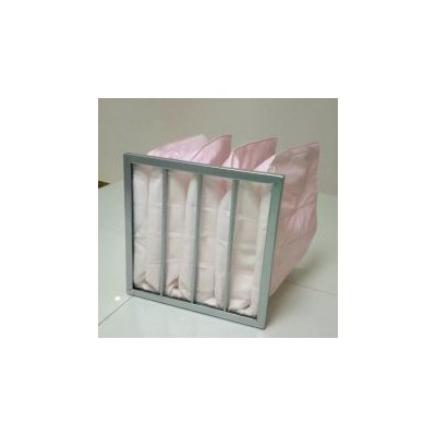 中效空氣過濾器(bag filter)邊框有冷板噴塑、鍍鋅板等形式,過濾材料有無紡布、玻璃纖維等,過濾粒徑1~5um,過濾效率60~95%(比色法),