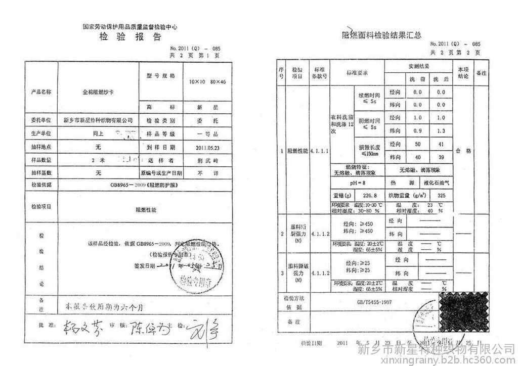 4) 根據國外客戶的要求,新星公司的服裝面料產品經常要送去國外專業檢測機構檢測,出具相關檢測報告和證書。由于我廠的產品一半以上出口量至歐美**,所以多年來,我廠獲得了許多歐美國際檢測機構出具的產品檢測報告和相關證書,如歐盟阻燃認證EN11611,EN11612,EN14116等,國際紡織品環保認證Oeko-Tex100(瑞士),美國阻燃布檢測報告NFPA2112,NFPA701,NFPA70E,ASTM D6413,CFR1615,CFR1616等等。