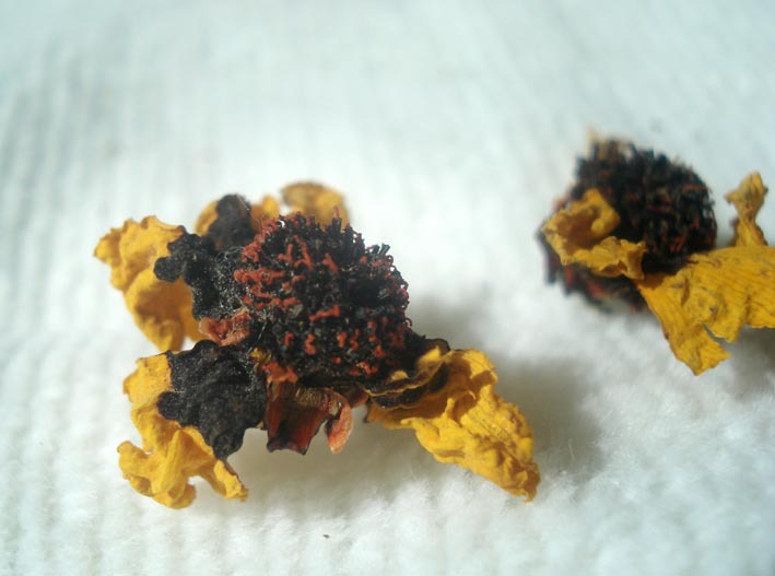 沸水浸泡,朵朵雪菊在杯中綻放,令人愛不釋手,艷黃花瓣包裹紫色花蕊,花型保持完整;普通菊花沖泡后花瓣難以保持原型。