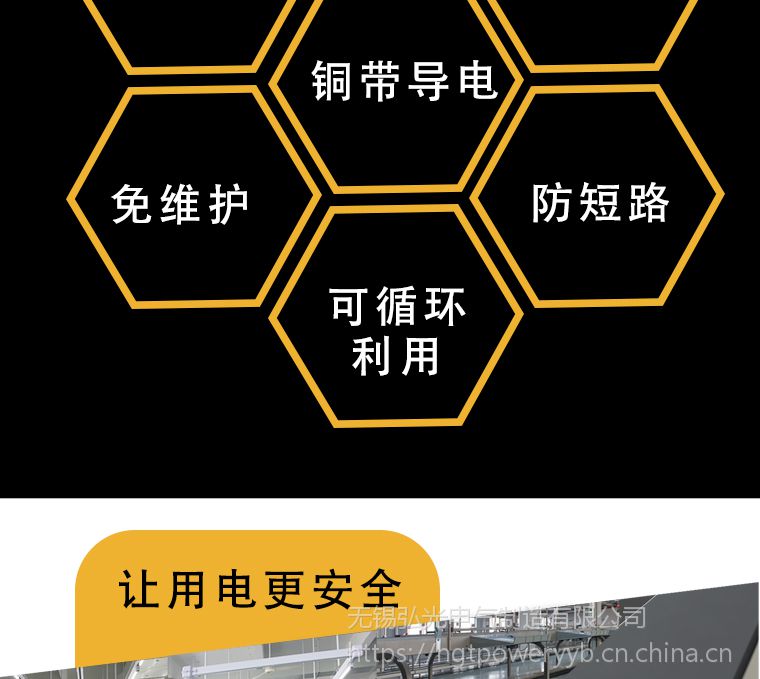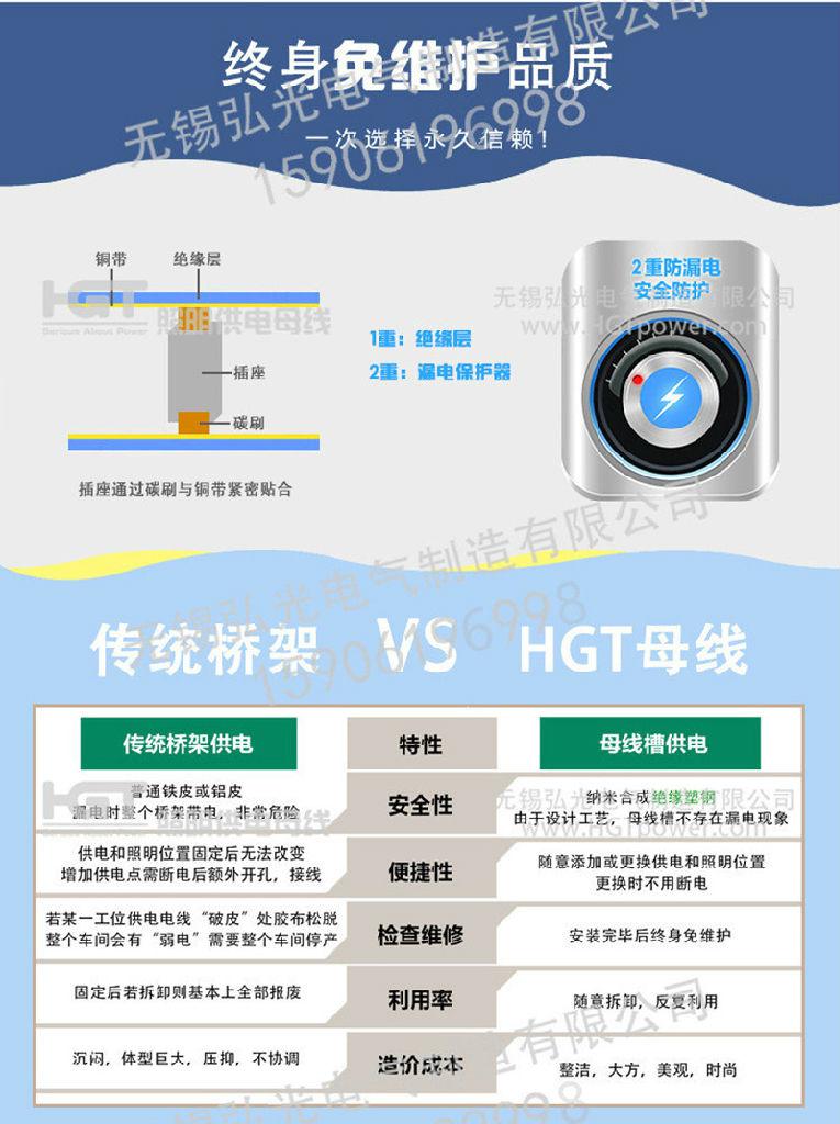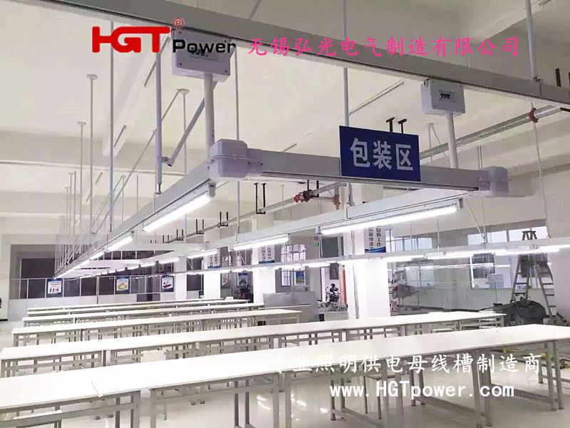 無錫弘光母線槽是一種新型供電設備比傳統供電橋架更安全,便捷,檢修方便,美觀大方而且可以重復利用。 母線槽的導電方式是通過絕緣體內2-7根導電銅帶,采用空氣絕緣的方式,形成照明和動力(220V&380V)單獨分路控制。 提供動力的移動供電插座(220V&380V)可在貫通的整條母線槽內滑動至任意位置供電并且可在任意位置增加或減少供電點。以碳刷為觸電的插座在通電情況下,可避免因插座滑動而產生火花,杜絕安全隱患。 母線槽正常采用標段(4米/根)對接方式進行安裝,使用過程中的檢修及維護非常簡單,方便,對于后續母線槽線路的移動和改造可重復利用,不會產生消耗。