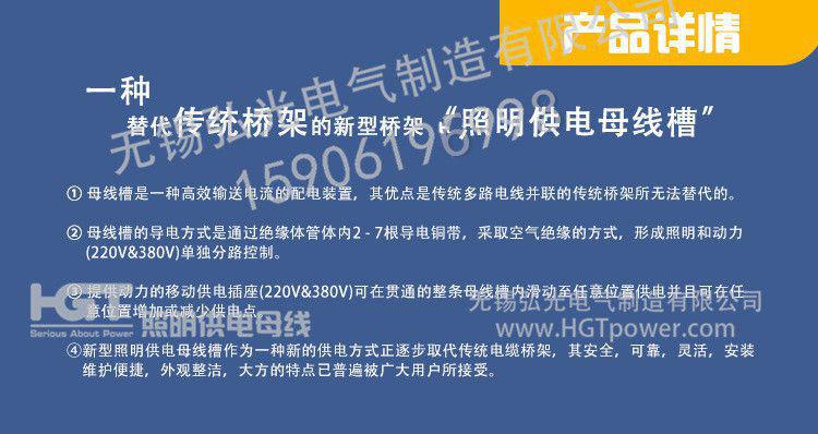 弘光電氣(HGT power)公司已通過ISO9001質量體系認證,CCC產品認證,CE產品認證。 公司主營產品(品牌:HGT照明供電母線槽):(1)照明供電母線槽系列產品;(2)移動安全插座系列產品; (3)移動供電導軌;(4)高速拉布機導軌;(5)高低壓配電箱、全系列主電源橋架。