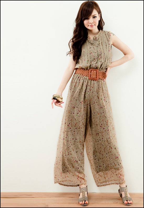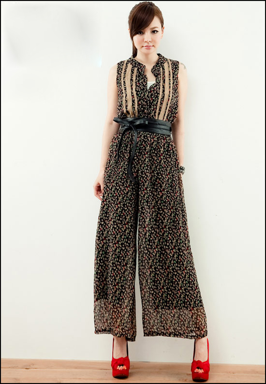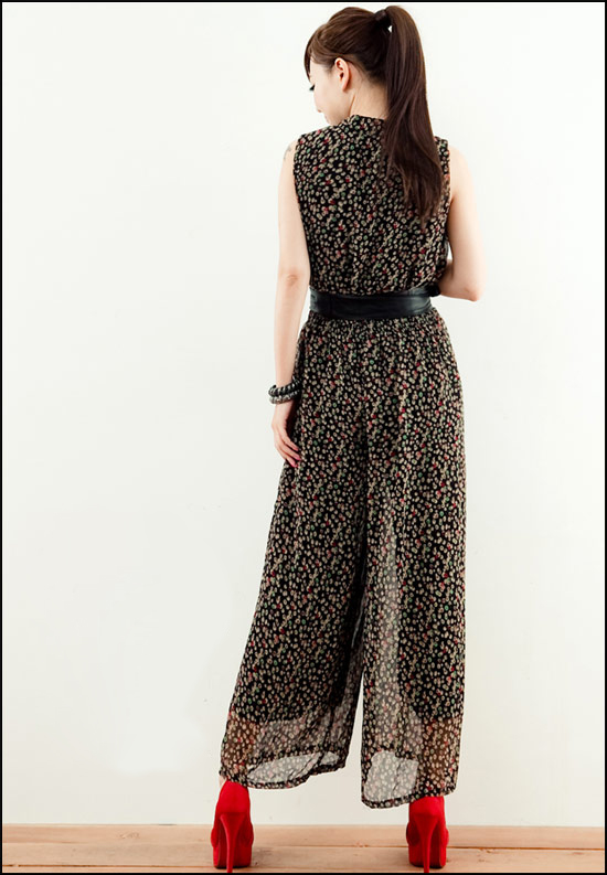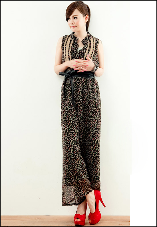 品名:K111678 黑色black(二色入內) 2012飄逸雪紡褲 碎花印花 束腰闊腿 連體長褲