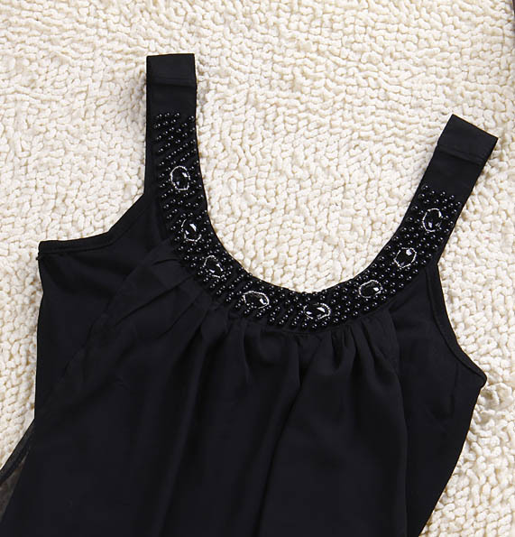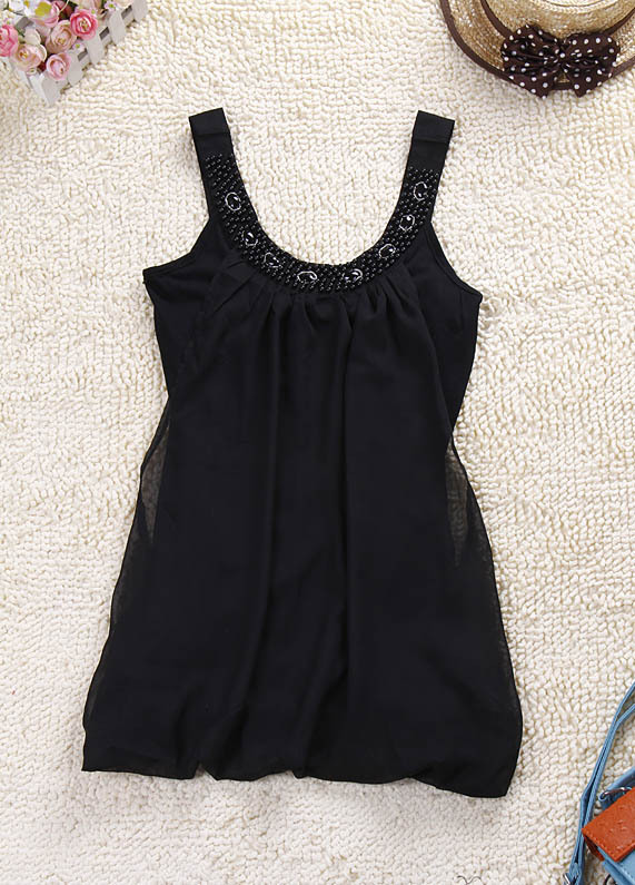 品名:Q17656圖片色 時尚女主角 圓珠寶石飾領雪紡拼接雙層燈籠背心洋裝