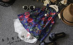 小辣妞 2015夏裝新品女童裝圓領(lǐng)小A版復(fù)古花朵棉麻吊帶衫