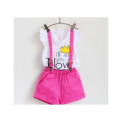 小辣妞2015韓版女童夏季新款字母飛袖背心可愛背帶2件套裝