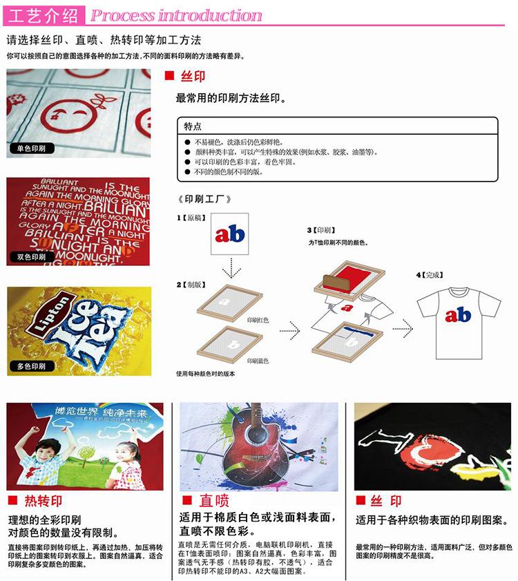 1、工藝:絲網印刷,數碼直噴,數碼熱轉印燙畫,圖案色彩還原好,不退色