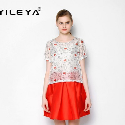 伊樂雅2015夏季女歐洲站紅唇朦朧紗裙子印花兩件套連衣裙DS
