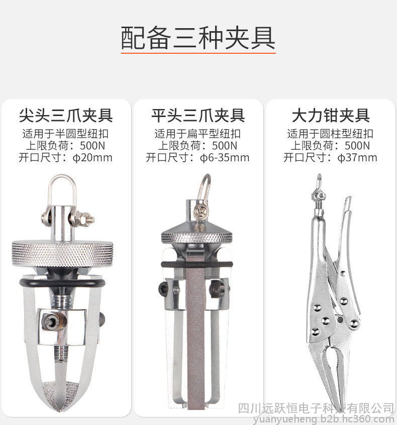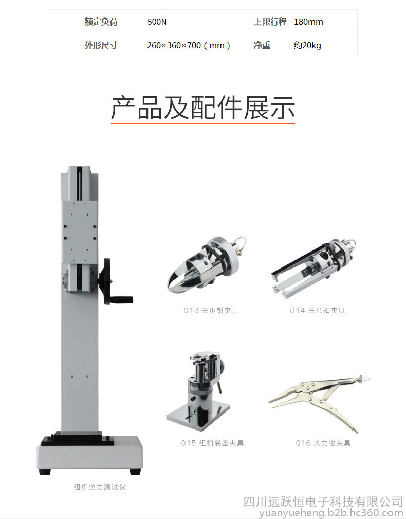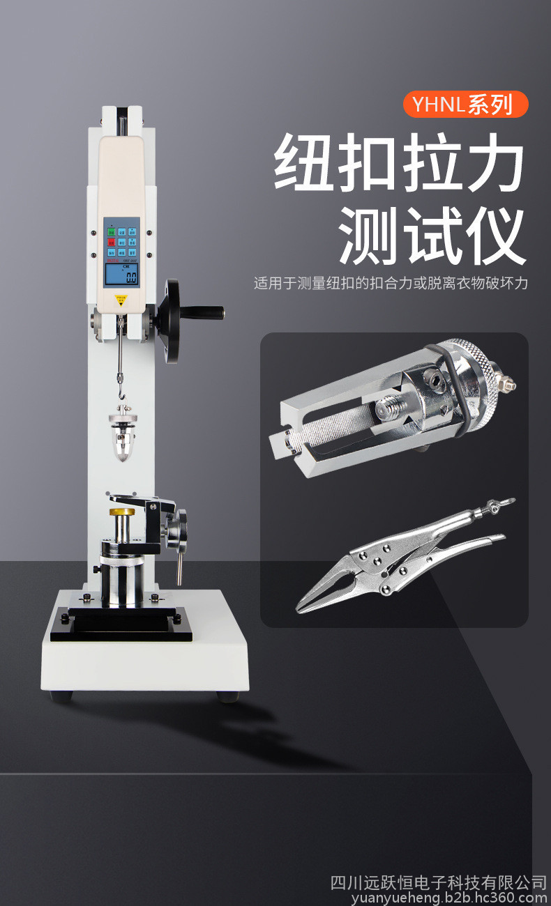 四川遠躍恒廠家供應(yīng)YHNL紐扣拉力測試儀300N 紐扣拉脫力檢測儀 紐扣拉力試驗機 測量鈕扣扣合力專用儀器,本司生產(chǎn)的紐扣拉力測試儀可配置YHNK、YHHF推拉力計和夾具,于測量鈕扣的扣合力或脫離衣物破壞力,檢測鈕扣、按鈕等固定強度很重要的一項標準,尤其是在嬰兒和兒童服裝設(shè)計及制造中為重要。